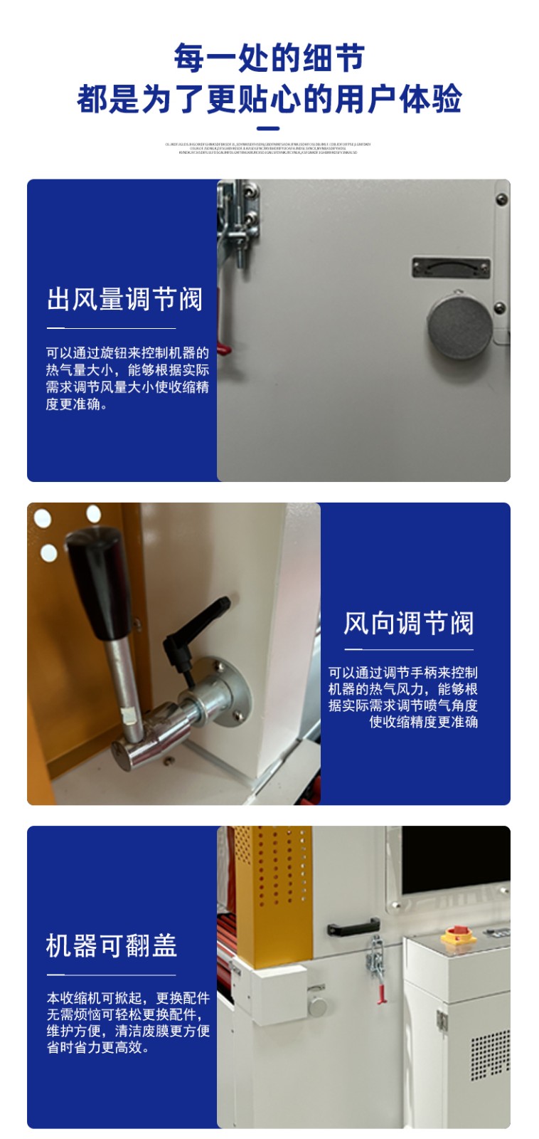 • 設(shè)備放置在干燥、通風(fēng)、無粉塵的車間環(huán)境:潮濕環(huán)境易導(dǎo)致電氣元件短路,粉塵過多會堵塞收縮爐出風(fēng)口、附著在加熱管表面降低效率,可加裝防塵罩。