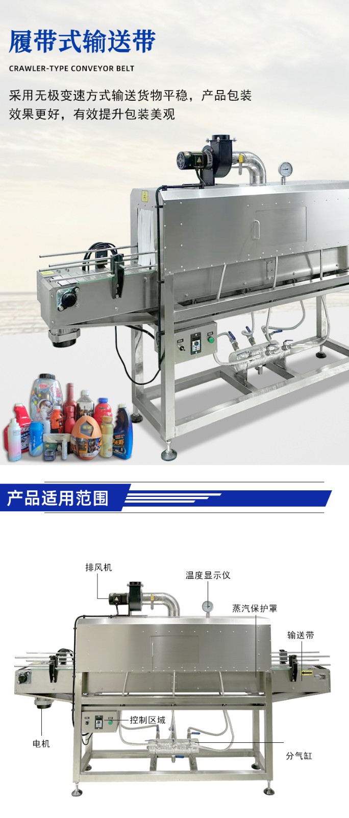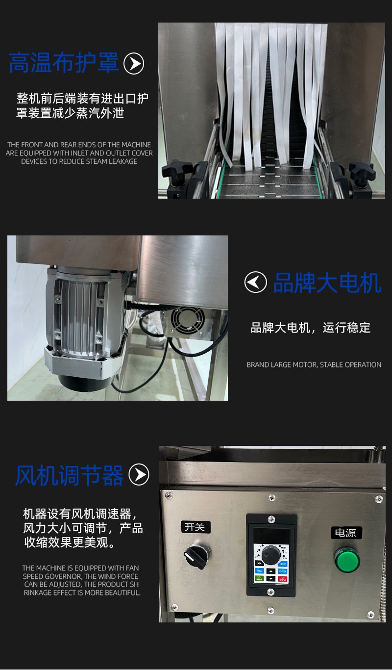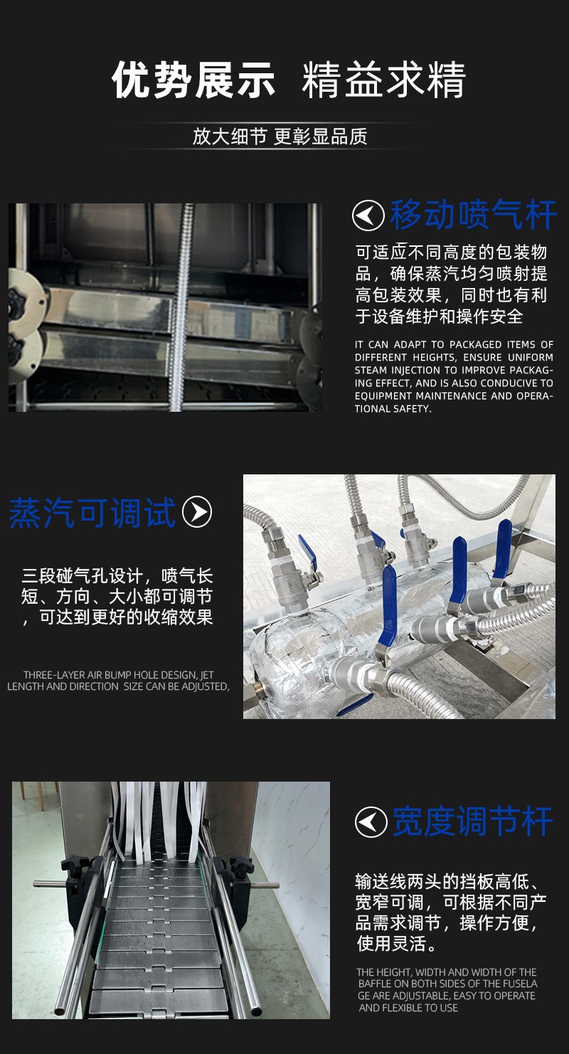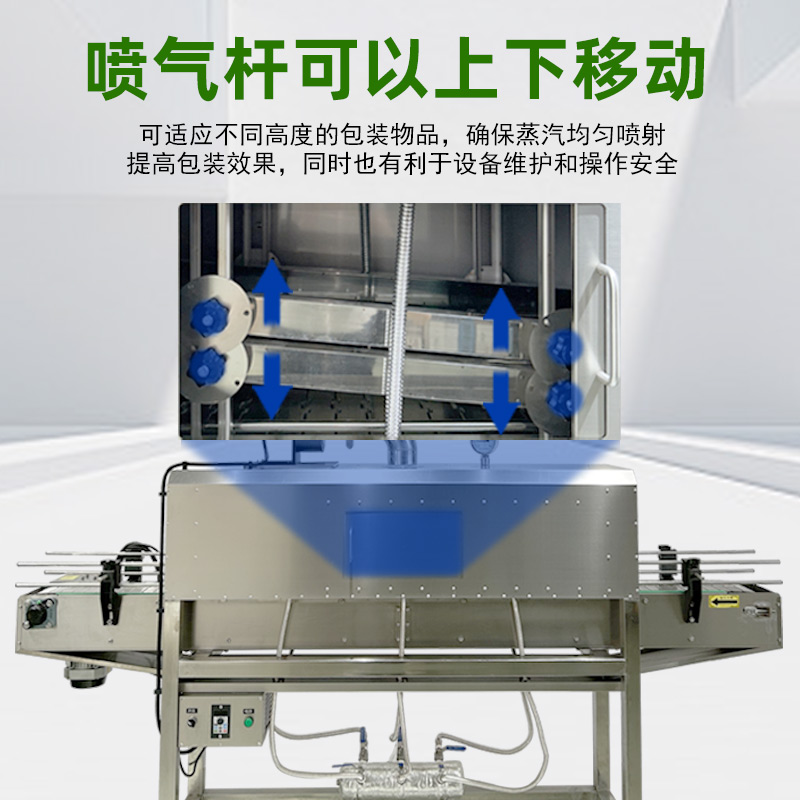 • 收縮通道:內(nèi)部設(shè)有蒸汽噴射孔或噴嘴,通道長度與寬度根據(jù)產(chǎn)品尺寸可調(diào),以確保蒸汽均勻覆蓋。