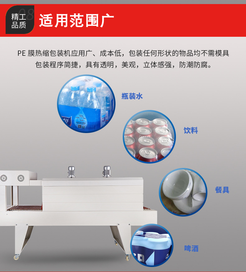 像洗發(fā)水、沐浴露等瓶體的包裝,以及各種小文具、小玩具等產(chǎn)品的包裝都可以使用熱收縮機。它能夠將多個產(chǎn)品組合包裝在一起,方便運輸和銷售。