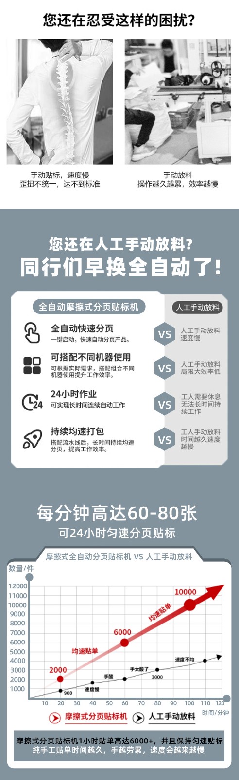 • 高速貼標(biāo):全自動分頁貼標(biāo)機(jī)采用先進(jìn)的機(jī)械結(jié)構(gòu)和控制系統(tǒng),具備極高的貼標(biāo)速度。一般來說,其貼標(biāo)速度可達(dá)每分鐘 100-300 張甚至更高,具體速度取決于設(shè)備的型號和配置。相比之下,人工貼標(biāo)速度慢,且難以長時(shí)間保持穩(wěn)定的高效率,全自動分頁貼標(biāo)機(jī)可以持續(xù)穩(wěn)定地高速運(yùn)行,大大縮短了產(chǎn)品的貼標(biāo)時(shí)間,提高了整體生產(chǎn)效率。