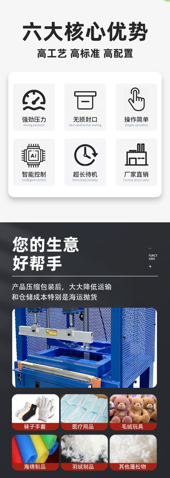- 其他行業(yè):如紡織品、皮革制品、化工原料等,也可采用壓縮真空封口包裝,起到防潮、防霉、防蟲蛀等作用,便于儲(chǔ)存和運(yùn)輸