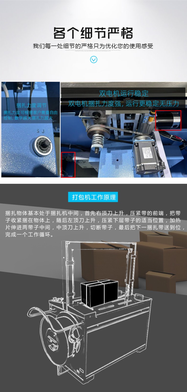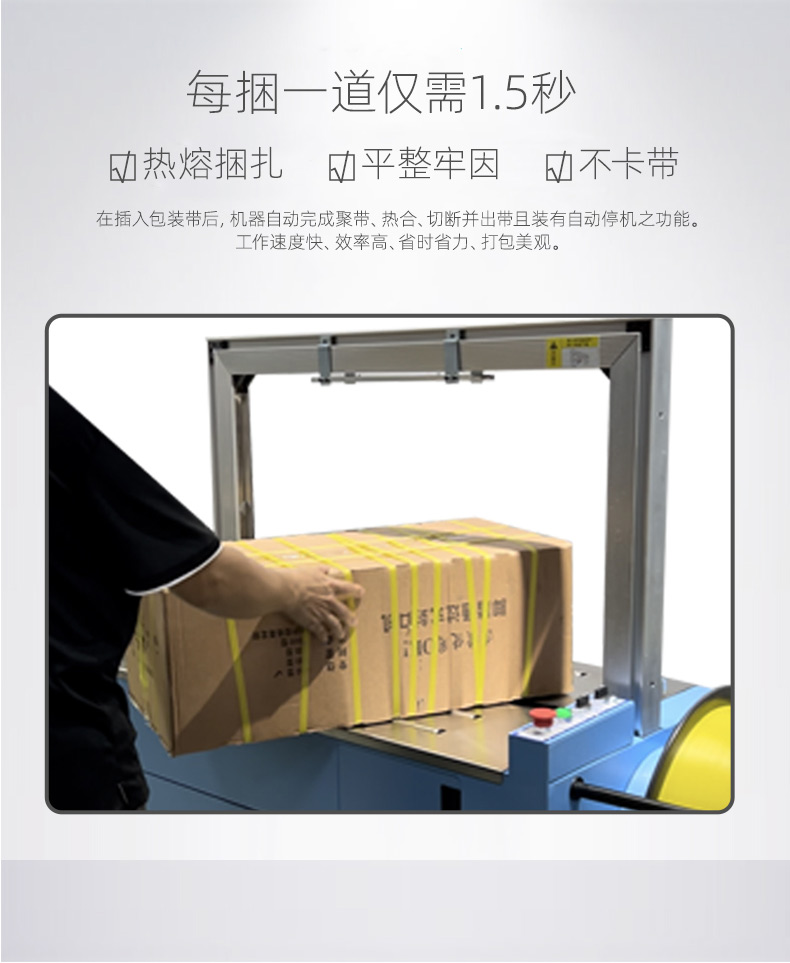 - 自動(dòng)上帶:機(jī)器啟動(dòng)后,會(huì)自動(dòng)從打包帶卷中抽出打包帶,并將其傳送到預(yù)定的位置,準(zhǔn)備進(jìn)行打包。這個(gè)過程無需人工干預(yù),大大提高了工作效率。