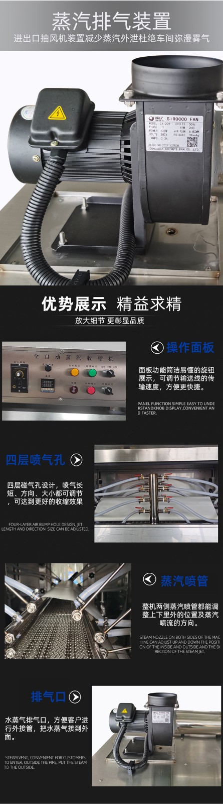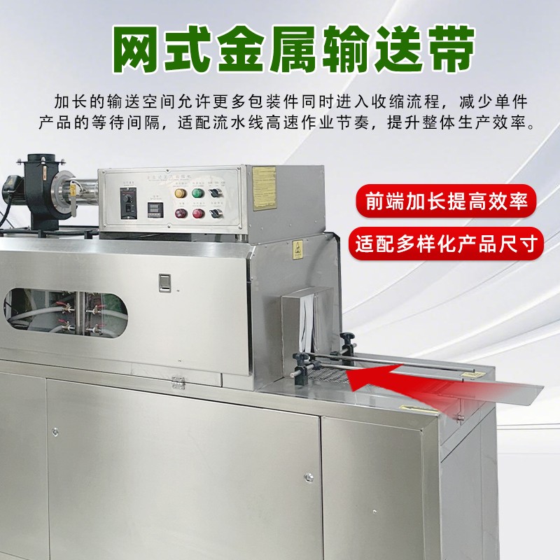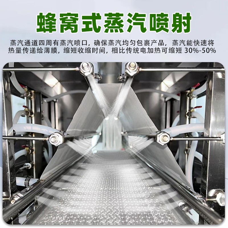 配備 PLC 智能控制系統,可精準調節蒸汽溫度(50℃-120℃可調)、輸送速度與蒸汽噴射量,兼容 POF、PVC、PE 等多種熱收縮膜材,滿足不同產品的包裝厚度與質感要求。